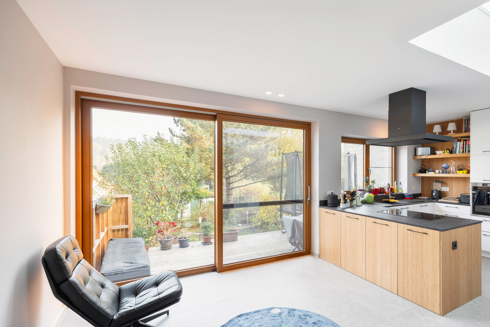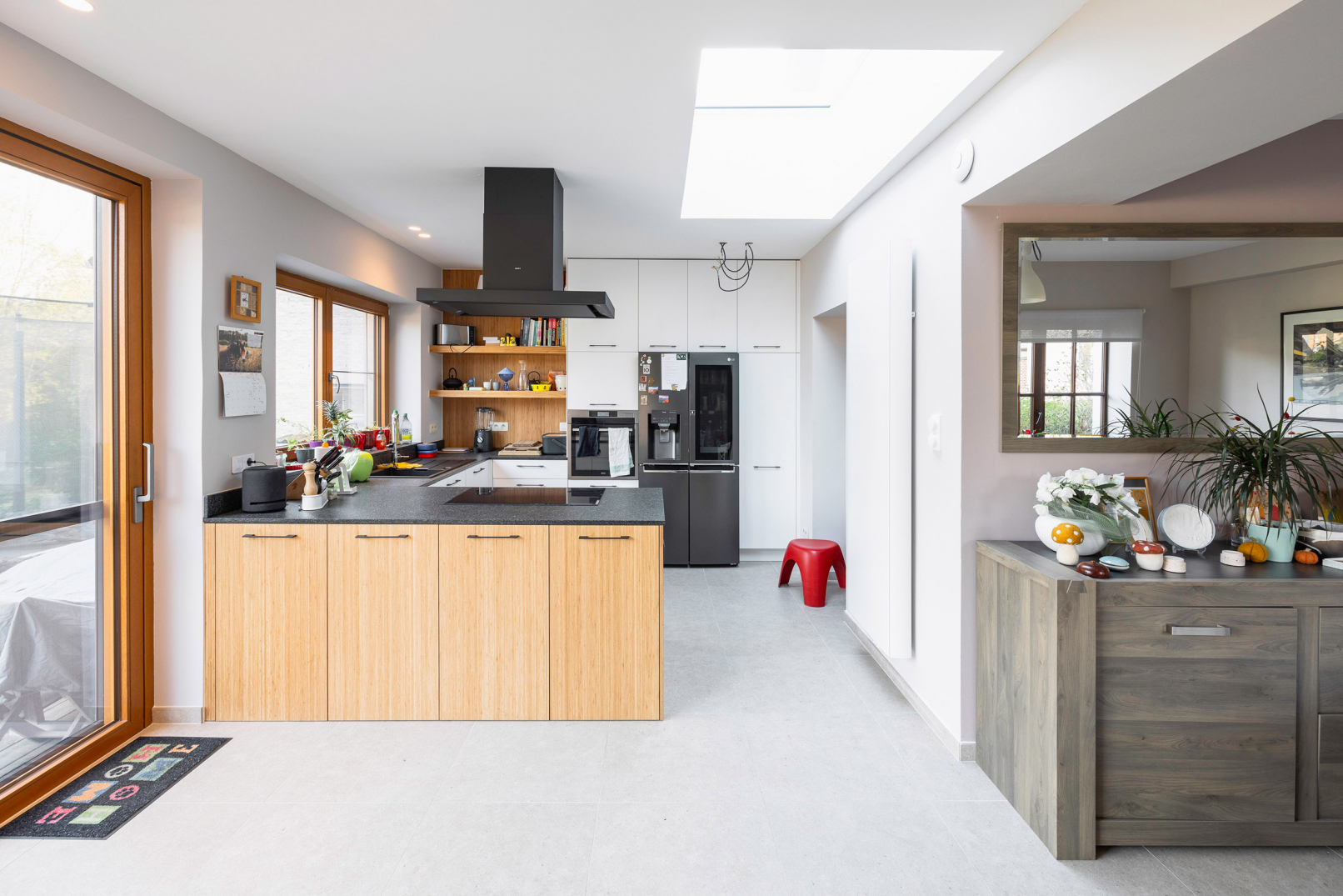 Nous avons ainsi créé une cuisine à manger, avec sa terrasse en prolongement vers le jardin afin de créer un dialogue avec celui-ci.