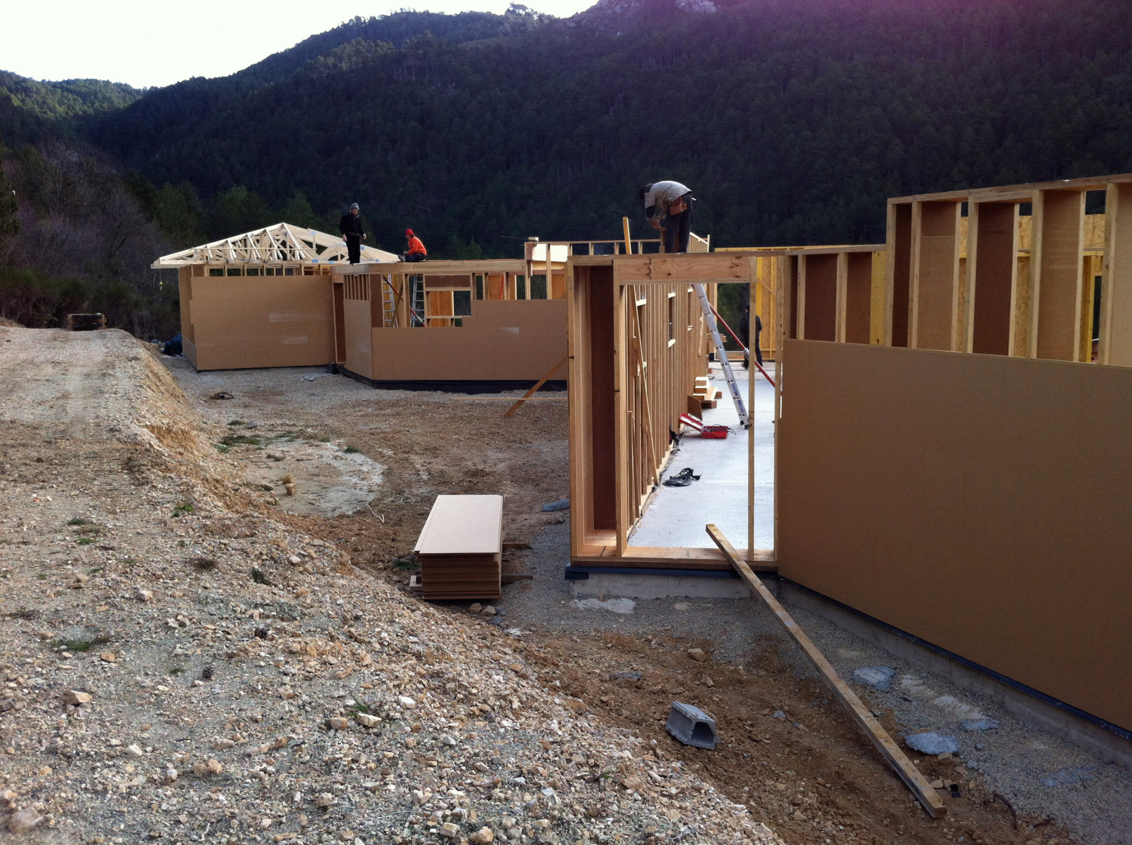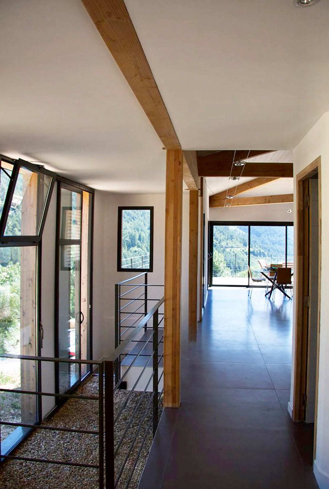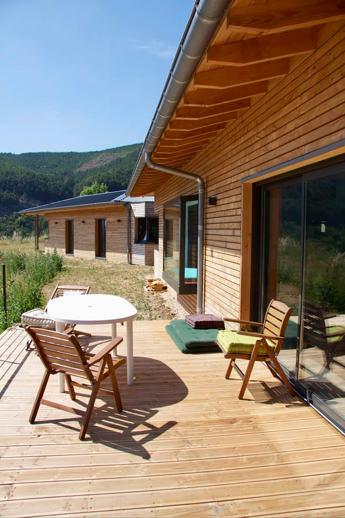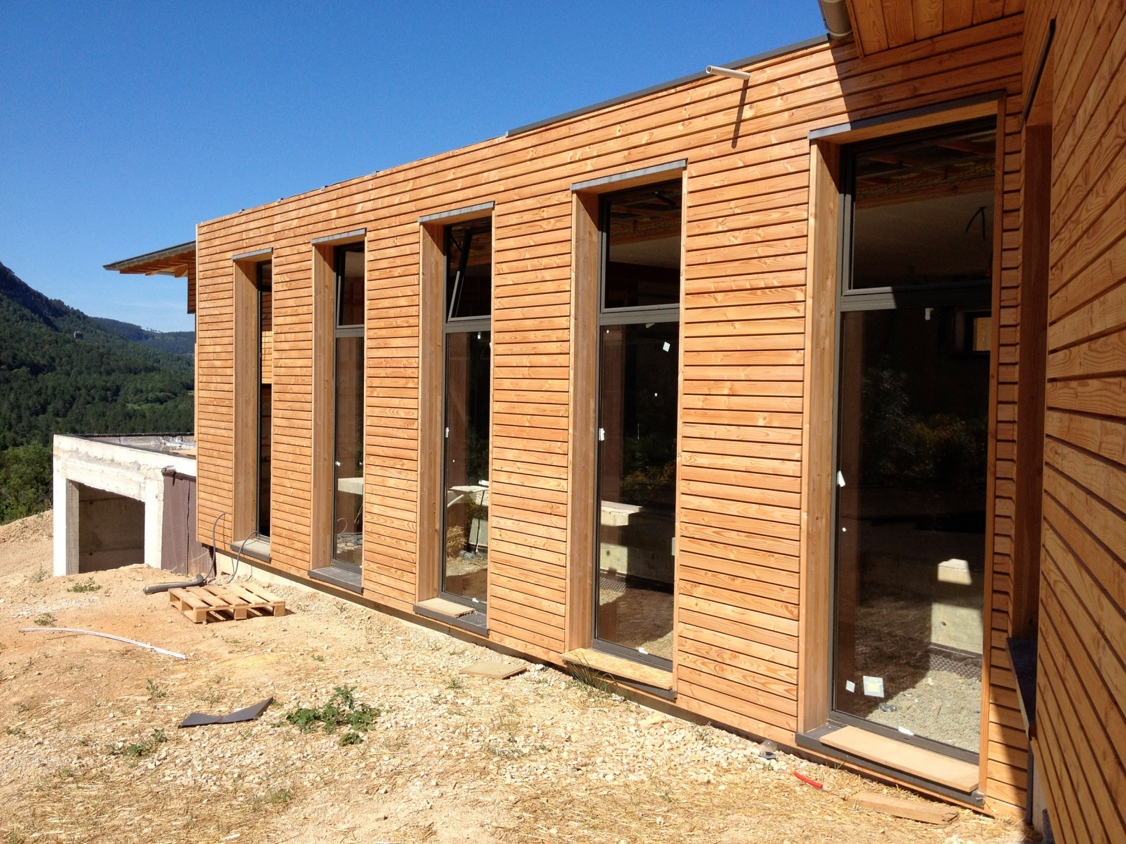 - - la 2ème venant de son exposition plein sud. Le soleil d'été devient une vraie contrainte. Afin de diminuer les surchauffes, nous avons prévu de longs débords en toiture, telle une casquette protégeant du soleil. La façade coté vallée est composée d'une ossature bois isolée par de la ouate de cellulose.