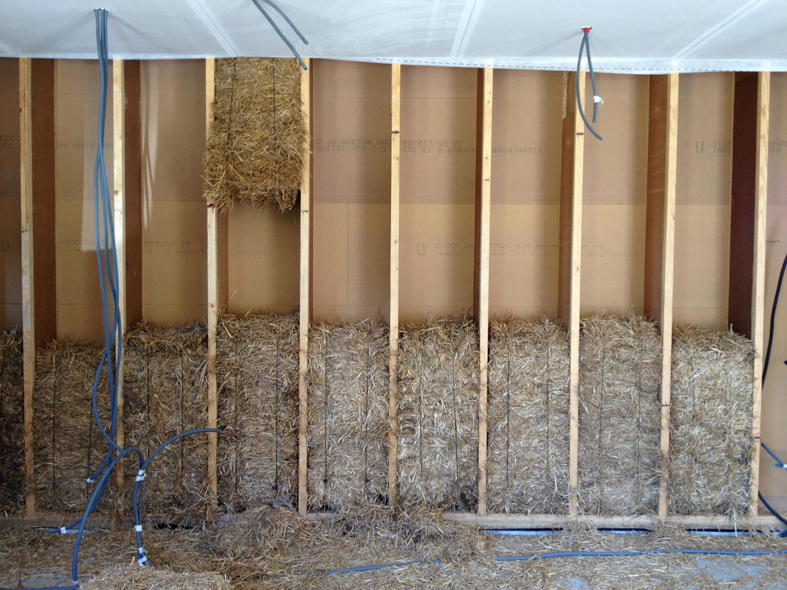 - - la 1ère venant des vents froids des Causses. Nous avons positionné un mur-paille comme adossement à la maison, la protégeant l'hiver.