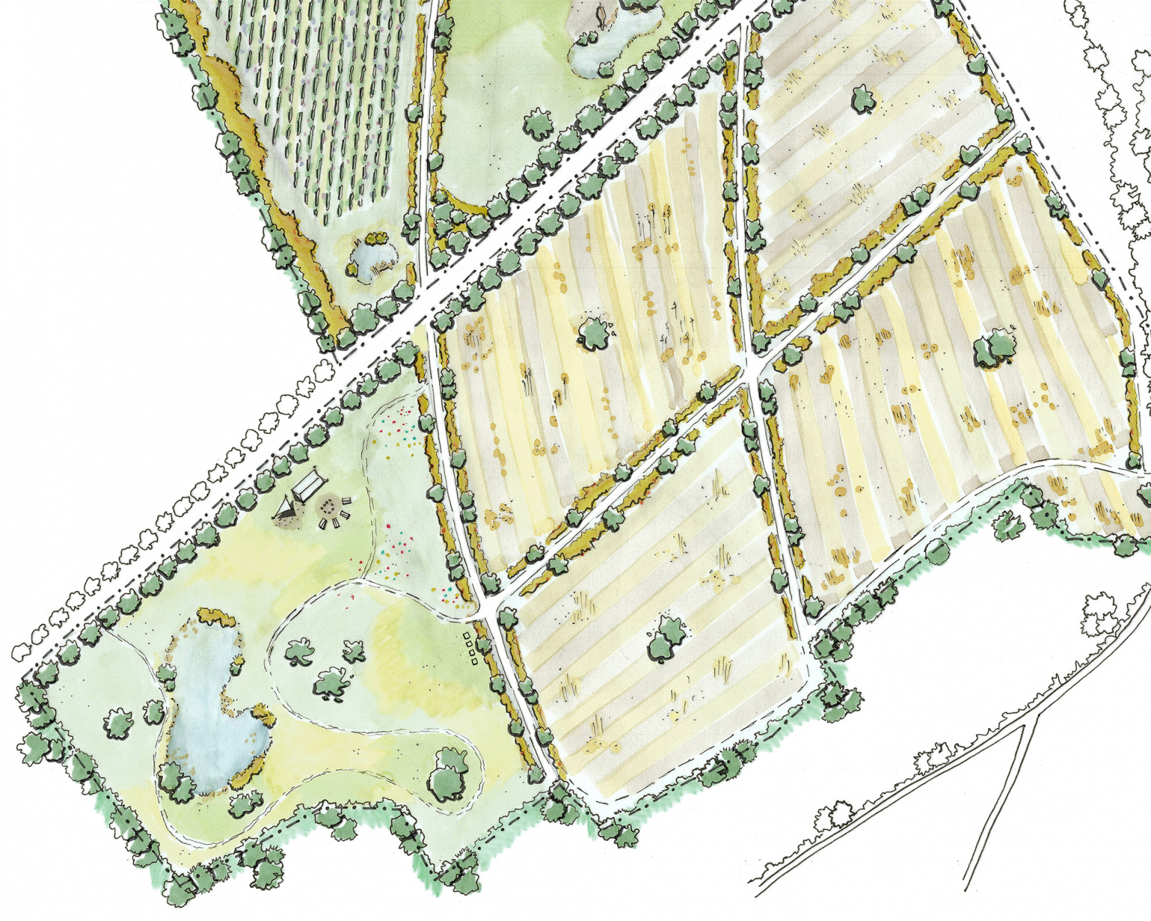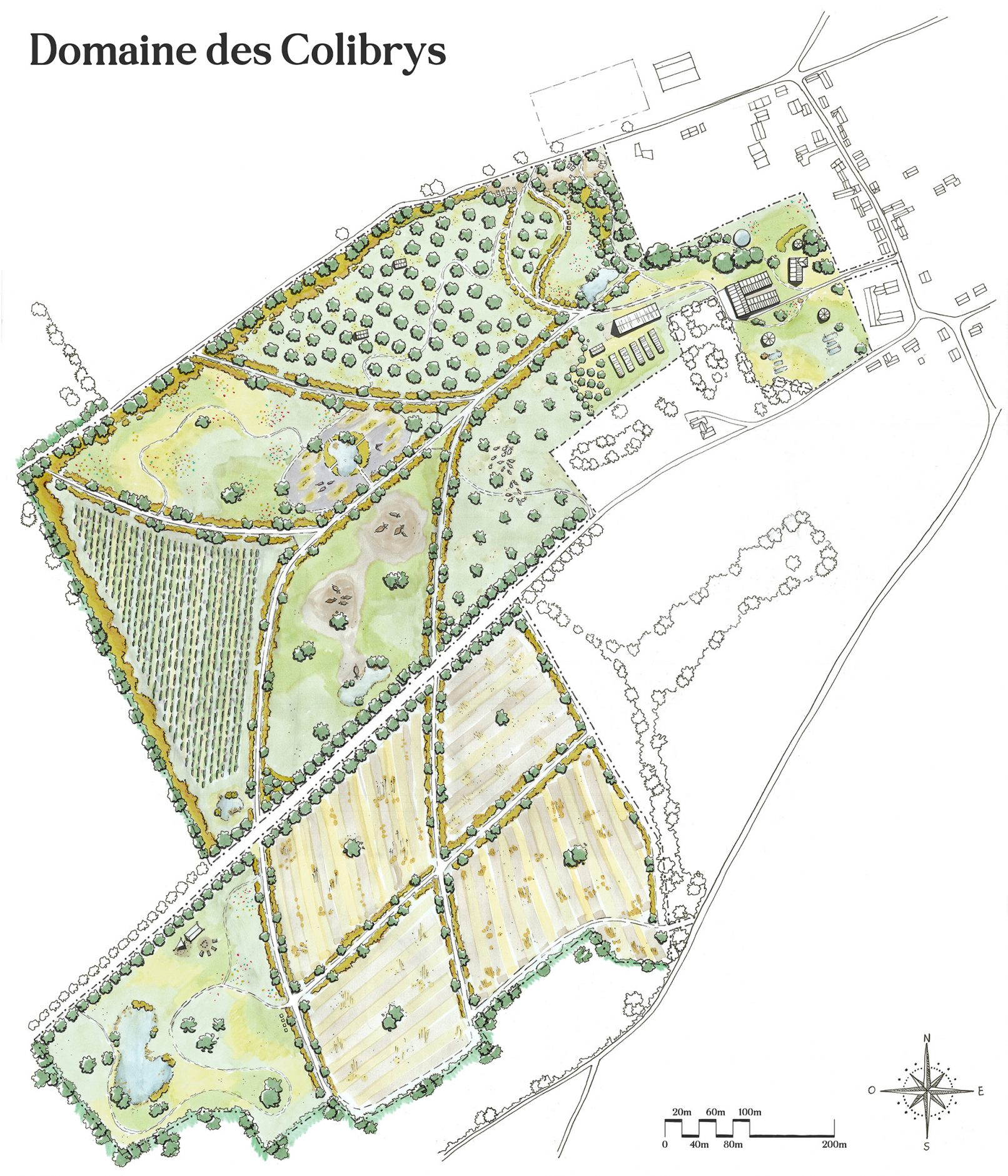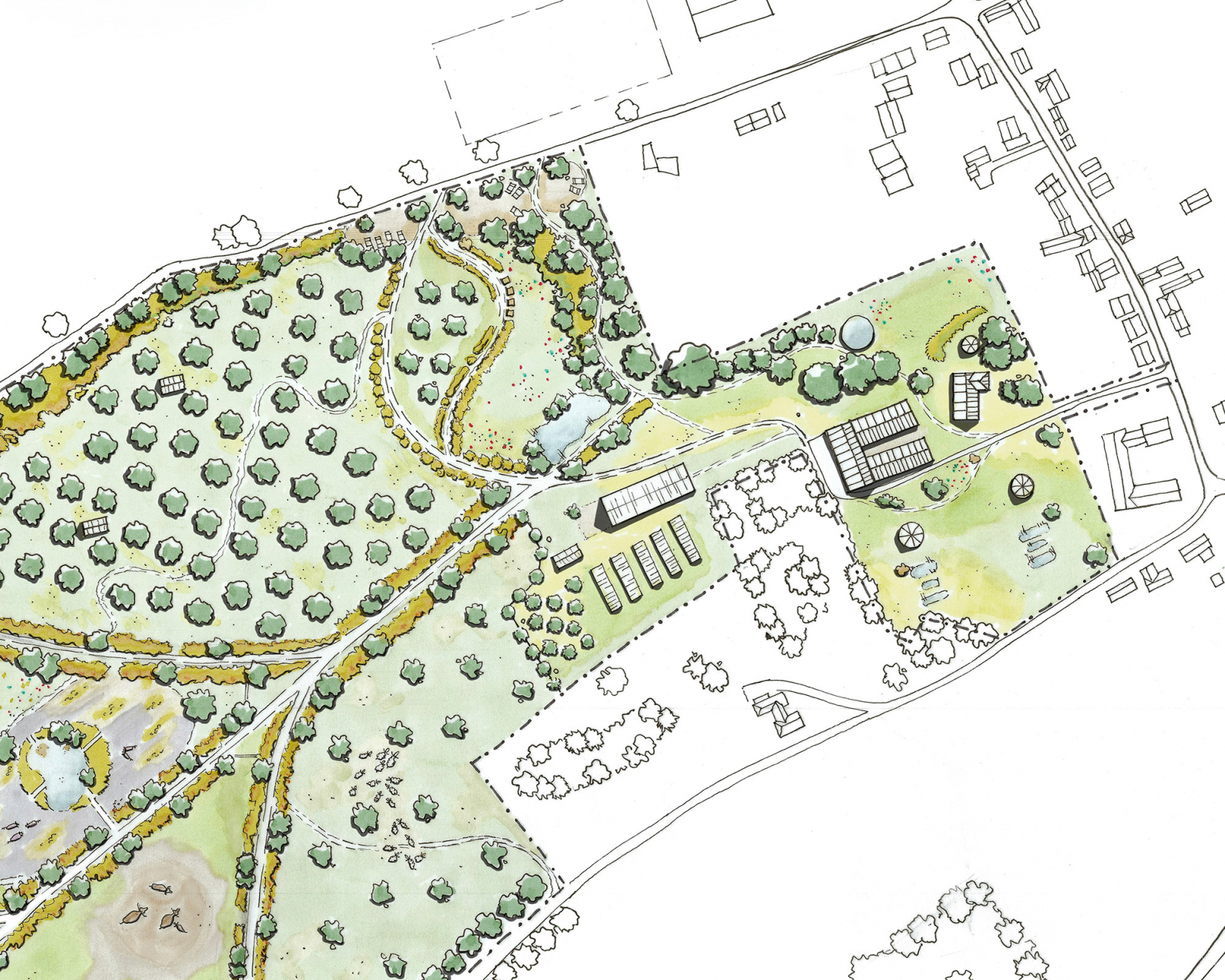 Notre proposition s'est orientée vers l’aménagement et l’agrandissement d’une école à pédagogie alternative déjà présente sur le site, la création d’ateliers d’artisans, d’une ferme et d’une serre-restaurant. Le design prend en compte également tout l’aménagement paysager (animaux, cultures…) selon des critères bioclimatiques, hydrologiques, de mobilité …